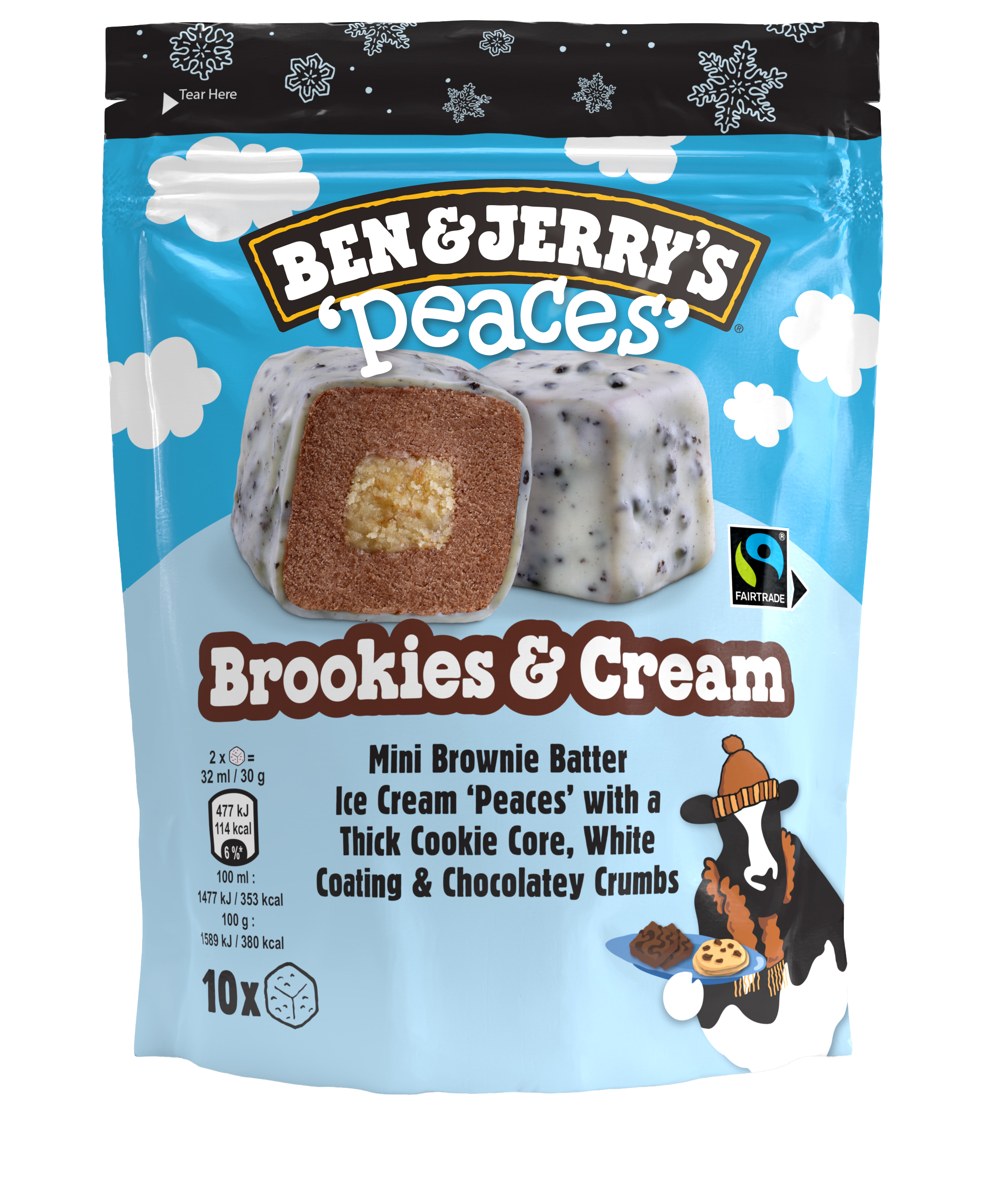 Ben & Jerry’s Brookies & Cream Peaces 10 kappaleen monipakkaus sisältää pieniä jäätelöherkkupaloja, joissa on brownie-taikinajäätelöä, paksu keksisydän ja päällä ihana valkosuklaakuorrute kaakaomurusilla. Brownie-taikina, jäätelö ja keksi muodostavat suussa sulavan yhdistelmän, jota olet aina kaivannut – vaikket sitä tiennytkään.