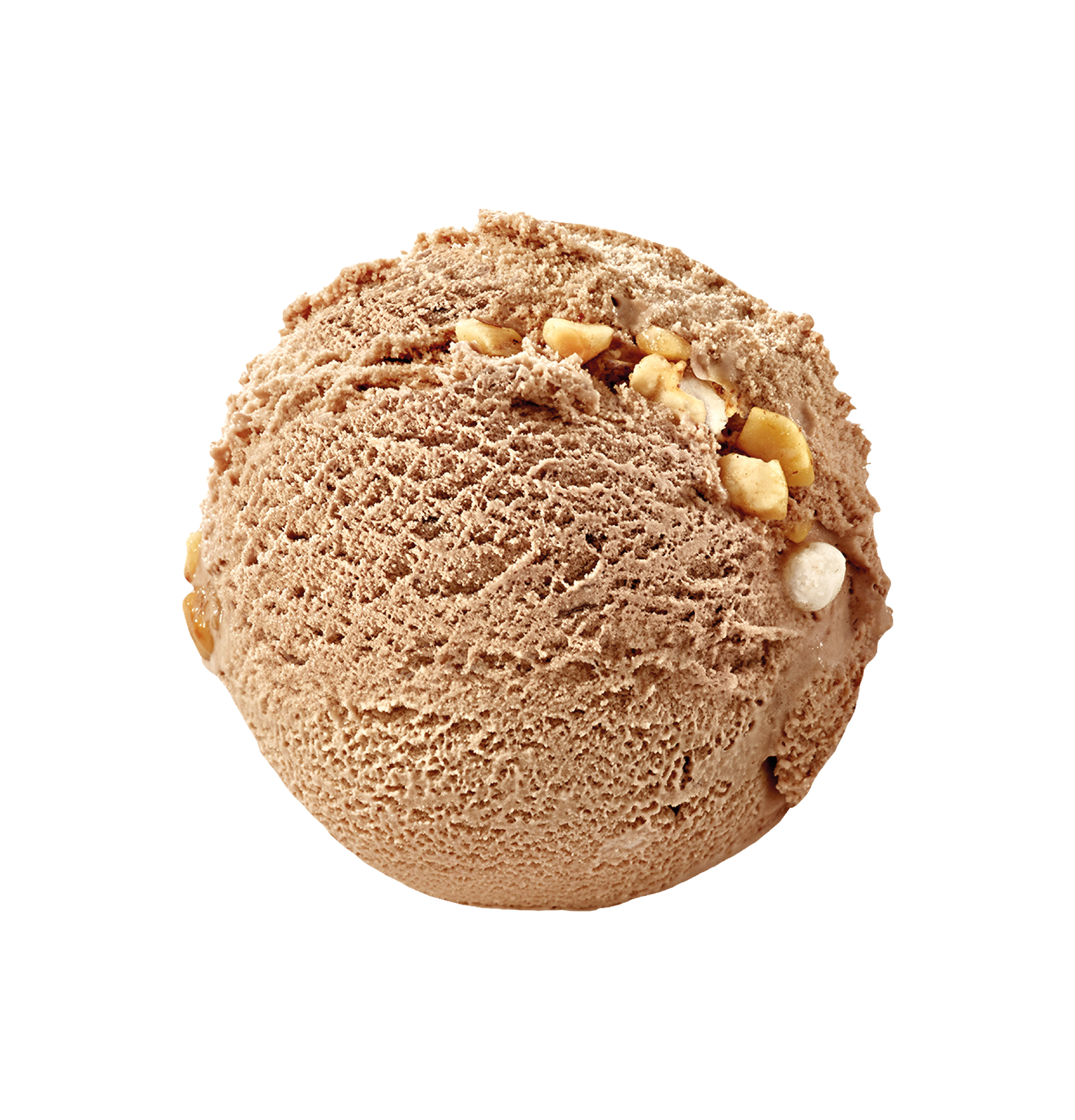 Hasselpähkinän makuista suklaajäätelöä (jossa 2% tummaa suklaata) koristeltuna hasselpähkinä-, marenki- ja vohvelipaloilla.