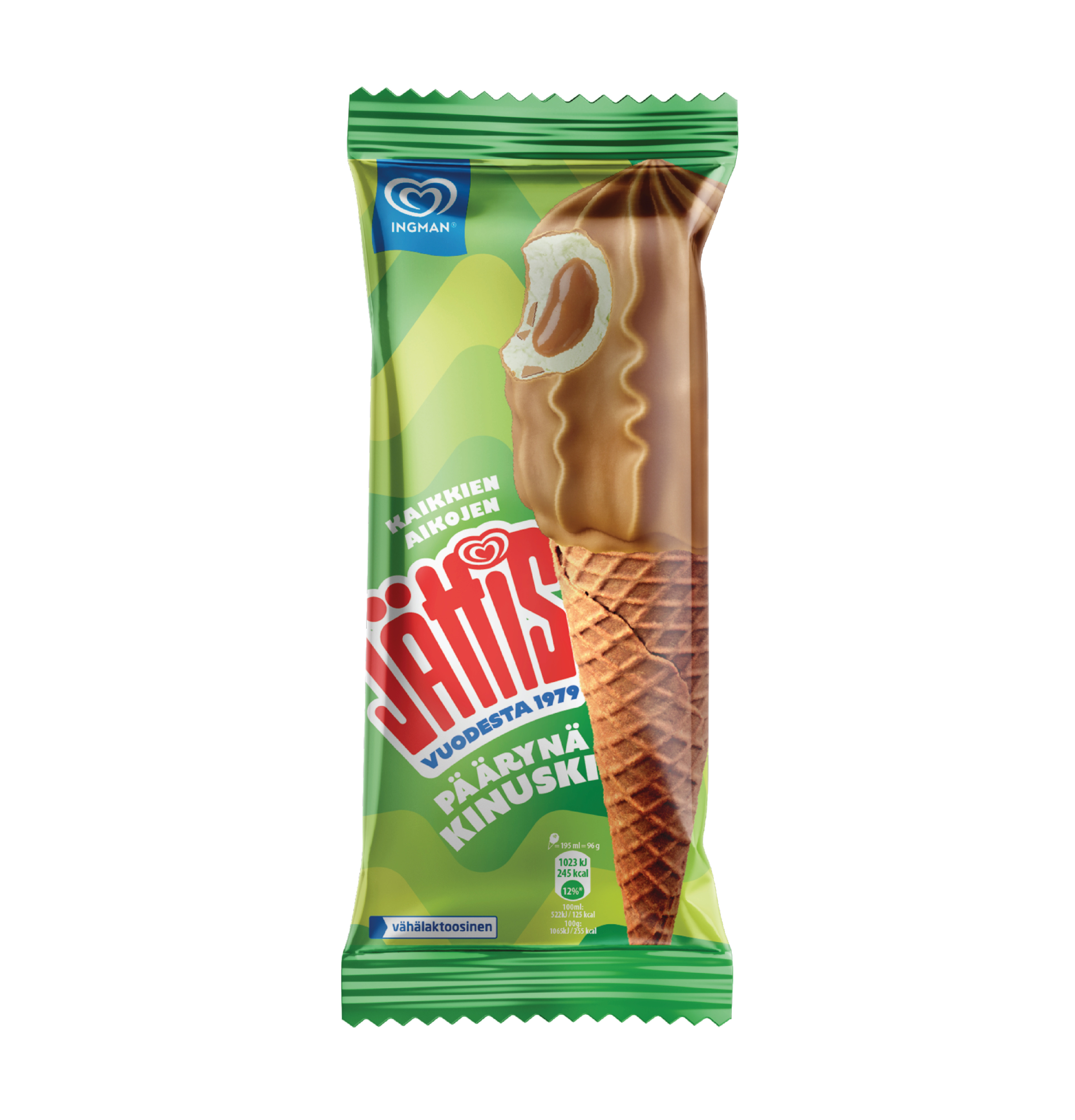 Makeaa kinuskikastiketta ja pehmeää päärynänmakuista kermajäätelöä, joka on dipattu kinuskikuorrutteeseen ja kätketty rapean vohvelin sisään. Vähälaktoosinen.