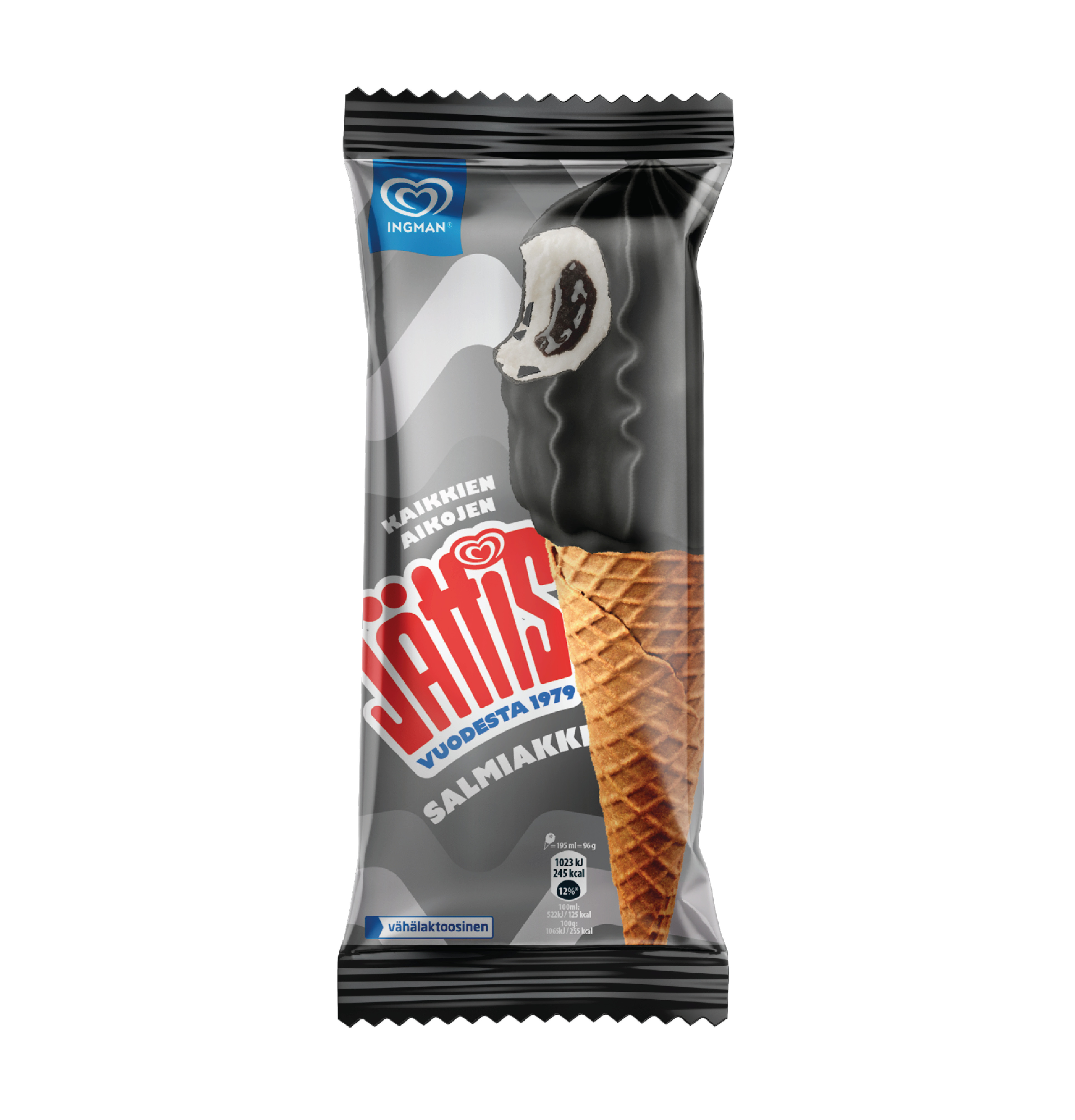 Makeansuolaista salmiakkikastiketta ja samettista vaniljakermajäätelöä, joka on dipattu raikkaaseen salmiakkikuorrutteeseen ja viimeistelty rapealla vohvelilla. Vähälaktoosinen.