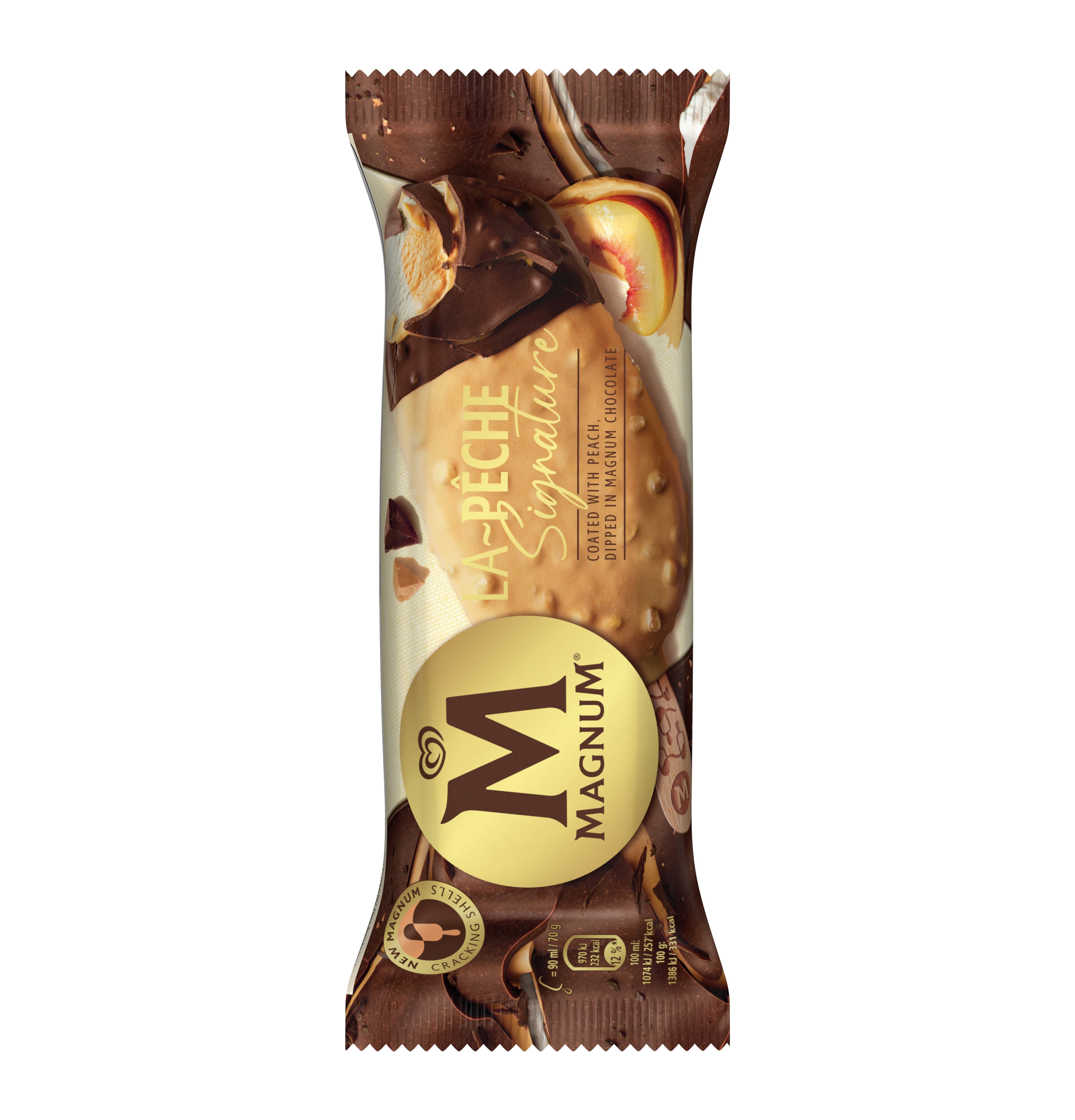 Magnum La Peche hurmaa hedelmäisen herkullisella persikkakuorrutteella ja persikkaisella gelato-ytimellä.